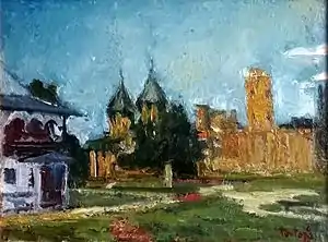It is not known exactly when the Curtea Domnească complex was built, but it certainly replaces an old manor house still in place by the 15th century during the reign of Mircea I of Wallachia.[4] Nevertheless, the first documentary mentions of the Curtea Domnească date from 1403 and 1409. It is therefore believed that the construction works started during the first reign of Vlad the Impaler, but that the complex remained unfinished. Archaeological excavations conducted in the mid-20th century have revealed that the Chindia Tower dates from the second half of the 15th century leading historians to propose that it is the "castle" referred to in the November 11, 1476, account of Hungarian nobleman Stephen V Báthory.[5] However, the tower is explicitly mentioned in documents at a relatively late moment. In 1595 Venetian traveler Antonio Pigafetta recorded the existence of a "tower in a church", which had an underground gallery in the direction of the Ialomiţa River.[6] In 1703 Rev. Edmund Chishull, chaplain to Lord Paget's English embassy at İzmir, said after visiting the place that the building was comparable to towers of "civilized Christianity".[7]