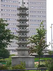 The Chinese Pagoda is a landmark in Birmingham, England. It is a 40-foot (12 m) granite carving of a Chinese pagoda, carved in Fujian, China and donated to the city by the Wing Yip brothers, founder of a local Chinese supermarket chain, in thanks to the city and its people for providing a home for them and their families and for the city's support over the years.[1][2]