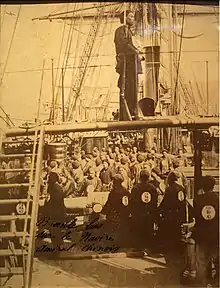 During the summer of 1876, Yangwu visited the Australian colonies,[6] and later in the year the Chinese ambassadors to Great Britain, Kwoh Song Tao and Liu-Si-hung, visited Yangwu via mail steamer in December while she was in Singapore.[10] Following the visit, she sailed to Manila.[11] When she arrived in February 1877, an accident occurred as the crew were preparing a gun salute for her entrance to the harbour. As the crewman loaded the charge into one of the guns, it detonated, throwing him from the ship and killing him. The crewman was subsequently buried in the city. Yangwu proved to be a spectacle for the inhabitants of the city, particularly the Chinese, some of whom had sailed out to greet her arrival in small boats and others who watched her from the mound on which the lighthouse sat overlooking the bay.[9]