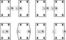 | 2, 4, 6 | Out | 9, 11, 13 | L side | 16, 18, 20 | On | 23, 25, 27 | R on/L out | 30-36 | On |