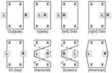 The moves involve jumping and repositioning the feet in some manner. Some of the more common moves are jumping so that both feet land outside the rope, both are inside the rope, one is inside and one is outside, or both are on top of the rope. These moves are called "out" (it may be thought of as "straddling".[14]), "in", "side", and "on" respectively,[13] which the two other participants chant as the player executes them. Some other, less common, moves involve manipulating the rope. A "pull" is when the jumper carries a side of the rope with one's foot or feet, generally crossing it over the other side. Crossing the ropes with one's legs in between them is "diamonds". One of these moves, called "scissors", is executed by starting with both feet outside the rope and then crossing the legs, with the ropes in tow, so that a formation resembling a pair of scissors is formed. The pattern "Chinese" features: