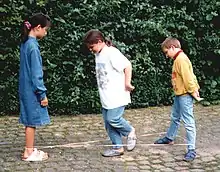 The game is typically played by three or more players using a string of rubber bands that has been tied into a circle, usually at least six feet long ("approximately 2 feet in diameter"[8]), or an elastic rope. Two of the participants (the holders) face each other several feet apart, and position the string around their ankles so that it is taut. The third player (the jumper) stands between the two sides of the rope and must accomplish a series of increasingly difficult moves without making an error. The position of the string is raised as the jumper moves through the levels,[7] from ankle to waist height and higher.[9] "They are great for stretching. Often a child gets so intrigued with the shapes the rope can make that [the child] stretches much harder than [the child] would have otherwise."[8]