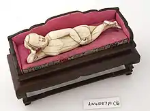 The dolls depicted a nude woman, lying either on her side or back, positioned in such a way that a user would be able to point to every part of the body.[5] They are typically made of ivory or jade and are uncolored, often with an accompanying pedestal shaped like a couch or bed made of ivory[5] or wood.[2] It is not uncommon, especially on older figures, for the woman to be depicted with small pointed feet, representative of the practice of foot binding which was common in China until the 20th century.[5][6] The figures typically measure anywhere from 75mm to 155mm in length.[5] In addition to the functional form, many of the dolls depict aesthetic additions including jewelry, fans, and shoes, and some feature colored hair, typically painted with lacquer.[2][6]