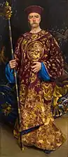 In chinoiserie fashion of the early 20th century, the dragon robes (and python robes) were at times cut and converted into Western-style attire, such as banyan and waistcoat; however, the direct alterations of Chinese garments for the use of Westerners are sometimes regarded as "imperialistic appropriation".[18]: 243–247 Some of these adapted dragon robe clothing were possibly fabric rolls and/or clothing looted from the Old Summer Palace contrary to what museum donors sometimes wish explain about their origins.[18]: 243–245 During the Opium wars, the use of Chinese dragons robes by Europeans in the late Victorian Europe were sometimes used to mock Chinese masculinity; for example, George Smith in the painting The Rightful Heir, exhibited in 1874 in the Royal Academy, would paint the villain found in the painting wearing a Chinese dragon robe tied with a belt around the waist with slippers on his feet.[18]: 246 In similar instances, Liberty in 1898 offered evening capes which were advertised as being made of "Mandarin robes" (i.e. Qing dynasty court dress); however, these capes were actually made of Han Chinese women's traditional skirts.[40]: 248 In 1981,