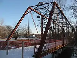 Northern portal and western (downstream) side of the Chinworth Bridge, which spans the Tippecanoe River west of Warsaw in Harrison and Wayne Townships of Kosciusko County, Indiana, United States.