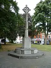 The Chipping Barnet War Memorial is located immediately west of St John the Baptist Church in Wood Street, Chipping Barnet, Greater London. It commemorates the men and women of the district who died in the first and second World Wars and is in the form of an octagonal base below a pedestal surmounted by a tapering column with a Celtic cross head. The cross is intersected by a corona in a flattened octagonal section. It was unveiled by Lord Byng of Vimy in April 1921.[1] Byng was born at nearby Wrotham Park in Hertfordshire.[2]