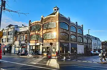 The 1910 Old Pack Horse is a Grade II listed public house on the corner of Chiswick High Road and Acton Lane, at the western end of Turnham Green common.[18] The building historian Nikolaus Pevsner writes that it has "plenty of jolly terracotta detail and bowed ground-floor windows".[14] The Chiswick Empire was a music hall theatre facing Turnham Green, opened in 1912 and demolished in 1959.[19]
