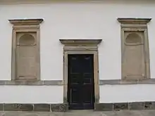 The brick-built Villa's facade is faced in Portland stone, with a small amount of stucco. The finely carved Corinthian capitals on the projecting six-column portico, carved by John Boson, are derived from the Temple of Castor and Pollux in Rome.[56] The inset door, projecting plinth and 'v'-necked rusticated vermiculation (resembling tufa) were all derived from the base of Trajan's Column. The short sections of crenellated wall with ball finials which extend out either side of the villa were symbolic of medieval (or Roman) fortified town walls, and were inspired by their use by Palladio at his church of San Giorgio Maggiore in Venice and by Inigo Jones (1573–1652) (Palladio produced woodcuts of the Villa Foscari with crenellated sections of walls in his I quattro libri dell'architettura in 1570, yet they were never built). To reinforce this link, two full-length statues of Palladio and Jones by the celebrated Flemish-born sculptor John Michael Rysbrack (1694–1770)[lower-alpha 1] are positioned in front of these sections of wall. Palladio's influence is also felt in the general cubic form of the villa with its central hall with other rooms leading off its axis. The villa is a half cube of 70 feet (21 m) by 70 feet (21 m) by 35 feet (11 m).[57] Inside are rooms of 10 feet (3.0 m) square, 15 feet (4.6 m) square and 15 feet (4.6 m) by 20 feet (6.1 m) by 25 feet (7.6 m). The distance from the apex of the dome to the base of the cellar is 70 feet (21 m), making the whole pile fit within a perfect, invisible cube. However, the decorative cornice at Chiswick was derived from a contemporary source, that of James Gibbs's cornice at the Church of St Martin-in-the-Fields, London.