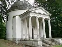Beyond the exedra in the gardens lies an area known as the 'Orange Tree Garden' in which was situated a small garden building known as the Ionic Temple. The Ionic Temple is circular in form and is derived from either the Pantheon in Rome or possibly from the Temple of Romulus. The portico of this temple is derived from the Temple of Portunus which William Kent illustrates in the ceiling of the Red Velvet Room within the Villa. Immediately in front of the Temple lies a circular pool of water with a small obelisk positioned in its centre. Around the base of the pool of water are three concentric rings of raised grass conforming originally to a 3:4:5 ratio echoing the dimensions of the Red and Green Velvet Room within the Villa. A second obelisk was erected at the centre of another patte d'oie ('Goose Foot', a set of paths converging at a point) beyond the cascade to the west of the Villa.