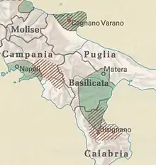 Traditional diffusion of the chitarra battente in the Southern Italy (red pattern).[1]