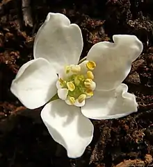 Choisya /ˈʃɔɪziə/[2] is a small genus of aromatic evergreen shrubs in the rue family, Rutaceae. Members of the genus are commonly known as Mexican orange due to the similarity of their flowers to those of the closely related orange, both in shape and scent. They are native to southern North America, from Arizona, New Mexico, Texas and south through most of Mexico. In its generic name Humboldt and Bonpland honoured Swiss botanist Jacques Denis Choisy (1799–1859).[3]