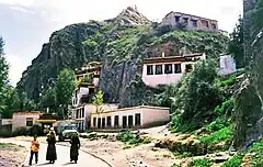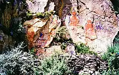 Some rebuilding has since taken place a number of old rock carvings have survived through damage. Some of them are thought to have been carved during the reign of king Songtsen Gampo (605 or 617? - 649 CE) and painted by Nepalese artists.[10] Some buildings have been rebuilt near the base of the hill and there is now again a small temple with prayer wheels.[13]