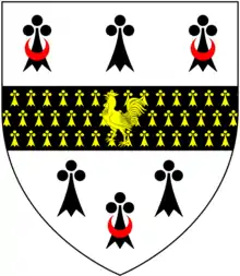 Arms of Mogg: Argent, on a fess pean between six ermine spots the two exterior in chief and the centre spot in base surmounted by a crescent gules a cock or[4]