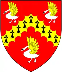 Arms of Rees: Gules, a chevron engrailed erminois between three swans argent wings elevated or[6]