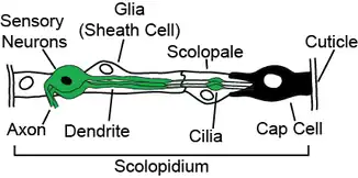 Chordotonal organs can be composed of a single scolopidium with only a single sensory, bipolar neuron (such as the tympanal ear of a notodontid moth), or up to several thousand scolopidia, each equipped with up to four sensory neurons (as in the mosquito Johnston's organ).[6] The bipolar sensory neurons each have an apical dendritic structure with a cilium densely packed with microtubules and surrounded by two specialized cells, the scolopale cell and the attachment (cap) cell, plus a glial cell.[2] Mechanically gated ion channels are located distal to the ciliary dilation, a characteristic part of the upper dendritic cilium. The cavity between the scolopale cell and the sensory neuron is filled with a specialized receptor lymph similar to the endolymph that surrounds the mechanosensory hair bundles of cochlear hair cells (high in potassium and low in sodium).[6] The dendritic cilia can have one of two major forms: in the mononematic form, the major connection between the attachment site and the cilium is a microtubule-rich attachment cell. The electron-dense extracellular material is small and localized mainly to the junction between the cilia and the attachment cell. The femoral chordotonal organ is mononematic. In contrast, in the amphinematic form, the extracellular material of the cap forms a dense, tubular sheath that surrounds the sensory cilium and extends all the way to the cuticle at the attachment site. In this form, the attachment cell contains both microtubules and actin-rich scolopale rods similar to those present in the scolopale cell. The Johnston's organ is an example of an amphinematic chordotonal organ. The functional significance of the morphological differences of the two forms is unknown, but may confer different viscoelastic properties on the sensory units.[7]