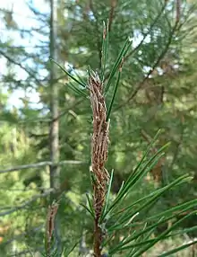 In early May to late June, larvae leave their hibernacula to search for food. They first mine or tunnel into year-old needles, closed buds, or newly developing vegetative or reproductive buds.