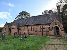 Christ Church is built of local brick with Bath stone dressings and a tiled roof. Red brick is predominately used, with some diapering using blue brick. Designed to accommodate 165 persons, the church is made up of a nave, chancel, organ chamber, vestry and north-west porch. There is a bellcote containing a single bell at the west end.[2] The floor of the nave is laid with red and black squared tiles, and the chancel laid with encaustic tiles from Mintons. Fittings include the pews of stained deal, the lectern and altar table of oak, and the pulpit, which is placed on a pedestal of Bath stone.[4] A wall tablet was installed in the church in 1915 in memory of Admiral Boultbee, who died in 1876.[6]