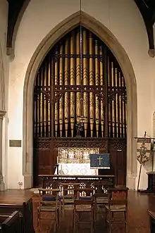 The church had an organ installed in 1857[6] by the celebrated builder Henry Willis who also became the church's first organist. The organ has since been replaced. In about 1968 dry rot was found directly above the organ and to repair the damage the organ had to be partly dismantled. It was stored in the church but was never re-assembled. At some point after this it was taken away and stored (possibly by the organ builders Mander). After some trials of the Allen computer organ, a smaller 2 manual tracker action instrument was installed at the rear of the church. The BBC visited the church and chose to broadcast their Morning Service soon after, however the Willis organ that they heard on their 'scouting' visit had been dismantled by the time they came to broadcast live.