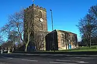 The piers and walls to the west and south of the church are Grade II listed buildings.[6] The free-standing building with the hipped roof and windows similar to those in the church is the former vestry.