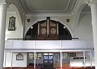 All of the nave's aisles are the same height as the rest of the church. The walls are plastered and the ceilings flat. The nave arcades have elliptical arches ("as shallow as Soane liked them") on thin Tuscan columns. The north and south galleries were removed during renovations to the church in 1951, but the west gallery, supported by cast iron columns, remains. In the gallery is the organ, previously in the chancel, now housed in a mahogany case including panels from the 1884 corvette HMS Calliope. In the south aisle is an eighteenth-century font.[2][5]