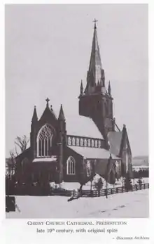 The Anglican diocese of Fredericton was established in 1845, with John Medley as its first bishop. Medley was a Tractarian and a proponent of Gothic Revival architecture.[1] As a clergyman in the Diocese of Exeter he had supervised the restoration and building of several churches according to the Gothic Revival principles of the Eccelesiological Society, and had been the founder and secretary of the Exeter Ecclesiological Society.[2]:128 Ecclesiology held that new church buildings should imitate those of the 13th and 14th century Decorated Gothic period, which displayed three essential characteristics lacking in Fredericton's existing wooden parish church: "reality", which meant that the building's structural elements such as rafters must be visible; a large chancel clearly separate from the congregation; and open bench seats rather than box pews.[3]:15