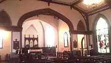 Christ Church's windows and war damage were repaired after the Civil War. It had its next major renovation in 1882–84, under the Rev. James R. Hubbard. This included re-roofing, as well as installation of stained glass windows. Renovations inside the church were consistent with the Oxford Movement (against which Virginia's bishops Johns and Whittle continued to rail). However, Bishop Whittle was pleased to confirm 41 people on March 24, 1884, and the parish hosted the diocesan convention two months later.[28] A side entrance was added in 1895, in addition to further repairs, and the rectory received a new porch and kitchen. The church was wired for electricity in 1906, and a parish house constructed as a memorial to a parishioner. A 1983 renovation removed a wooden organ and replaced it with a smaller modern instrument, creating a small chapel in that space.[29]