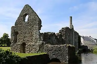 Nearby is a domestic Norman dwelling, known as the Constable's House, which was built within the original castle bailey in 1160. Much of the stonework survives, including a rare example of a Norman chimney (one of only five in the country). The stone used for construction was Purbeck marble.[4] The ground floor which has four slit windows was used as a storeroom. The upper floor, accessed by steps outside and an internal staircase, contained the main hall. It is 67 by 23 feet (20 by 7 m) in size.[4] As well as the chimney, another notable feature is the garderobe tower, which extends over the mill stream added in the early 13th century to provide sanitary arrangements.[1]