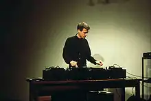 Citing the influence of John Cage, Yoko Ono and Vito Acconci, Marclay has long explored the rituals around making and collecting music.[7] Drawn to the energy of punk rock, he began creating songs, singing to music on pre-recorded backing tapes. Unable to recruit a drummer for his 1979 performances with guitarist Kurt Henry, Marclay used the regular rhythms of a skipping LP record as a percussion instrument.[8][9] These duos with Henry might be the first time a musician used records and turntables as interactive, improvising musical instruments.[10] Marclay sometimes manipulates or damages records to produce continuous loops and skips,[11] and has said he generally prefers inexpensive used records purchased at thrift shops, as opposed to other turntablists who often seek out specific recordings. In 1998, he claimed never to have paid more than US$1 for a record.[8] Marclay has occasionally cut and re-joined different LP records; when played on a turntable, these re-assembled records will combine snippets of different music in quick succession along with clicks or pops from the seams[12] – typical of noise music – and when the original LPs were made of differently-colored vinyl, the reassembled LPs can themselves be considered as works of art.