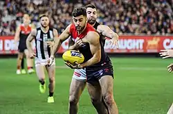 Salem was recruited by the Melbourne Football Club with their first selection and ninth overall in the 2013 national draft.[9] During the pre-season, he suffered from a thyroid issue which saw him lose six kilograms in the month following the draft.[10] He played the start of the season in the Victorian Football League (VFL) for Melbourne's affiliate team, the Casey Scorpions,[11] and after strong form in the VFL, including a thirty-two possession game in the VFL round three match against Frankston at Frankston Park,[12] he made his AFL debut a week later in the thirty-one point loss against Sydney at the Melbourne Cricket Ground in round six.[13] In his seventh match, Salem was pivotal in Melbourne's comeback victory against Essendon in round thirteen,[14] after marking the ball thirty metres directly in front of goal, he kicked the winning goal with nineteen seconds left in the match, giving Melbourne a one-point lead.[15] He finished his debut season with twelve matches[16] and senior Herald Sun football writer, Jay Clark, wrote he had the potential to become one of Melbourne's best players.[17]