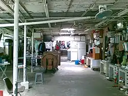 The dormitories in the main campus can only accommodate 72 persons, so some students live in the school's auxiliary dormitory on Cheung Chau and take kai-to to access the main campus.[23] The tables and bookcases are handmade by students. There are only eight toilets at the campus.[24] The campus has a wargame field, built and maintained by students. A stone on a slope overlooking the campus pose possible threat to the school.[20][22]