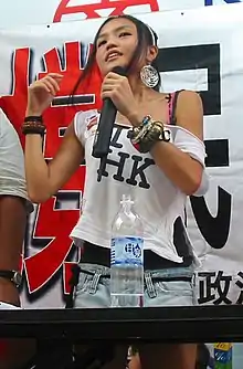Chan became known by the general public during the Olympics torch relay in Hong Kong where she held the Tibetan snow lion flag, and engaged in a confrontation with the pro-Beijing camp. She was forcibly removed by the Hong Kong Police Force, who claimed it was "for her protection".[3][4][5]