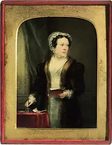 During the 1830s, Robertson was travelling away from her family; although she gave birth to eight children, four of whom survived infancy.[2] She worked in Paris in the mid 1830s and met members of the Russian Court, who could have already seen her work as engravings in magazines,[2] and so she was tempted to join them in St Petersburg. There would have been more commissions than normal to replace the paintings lost in the fire that destroyed the Winter Palace in 1837. Saunders was in St Petersburg from 1839 to 1841 where she carried out full length painting of Tsar Nicholas I[2] and Empress Alexandra and her three daughters - Maria, Olga and Alexandra. In 1841 she was the first, and only woman,[2] to be made an honorary member, of the Imperial Academy of Arts.[4][1]
