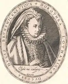 At the death of her father, in prison in Denmark in 1559, her elder sister Dorothea assumed the claimant title of Queen of Denmark in exile as the heir of her father's claim.[4] She would however need the help of her mother's Habsburg dynasty to press her claims, but as a childless widow beyond the usual childbearing age, Dorothea was no longer considered politically useful, and the Habsburg dynasty showed no interest in helping her take the throne. The Danish loyalists loyal to her father's line, headed by the exiled Peder Oxe, therefore asked Christina to persuade Dorothea to surrender her claims to Christina and her son.[4] Christina made Oxe a part of the Ducal council, and in 1561, she visited Dorothea, and reportedly followed his advice and convinced Dorothea to surrender her claim.[4] After this, Christina styled herself the rightful Queen of Denmark, Norway and Sweden. In February 1563, she referred to herself as "Christina, by the grace of God Queen of Denmark, Sweden, and Norway, Sovereign of the Goths, Vandals, and Slavonians, Duchess of Schleswig, Dittmarsch, Lorraine, Bar, and Milan, Countess of Oldenburg and Blamont, and Lady of Tortona."[4] In reality, she had no access to these thrones and had difficulty pressing her claim to them.