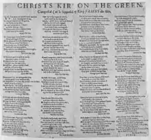 "Christis Kirk on the Green" is an anonymous Middle Scots poem in 22 stanzas, now believed to have been written around the year 1500, giving a comic account of a brawl at a country fair. It was for many years mistakenly attributed either to James I of Scotland or to James V of Scotland. It gave rise to a whole tradition of humorous poems on similar subjects by Scottish poets down the centuries, including Allan Ramsay and Robert Burns, and is still one of the most frequently published works in Middle Scots.[1] "Christis Kirk on the Green" has been called one of the finest performances in 15th-century British poetry.[2]