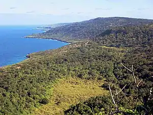 Of the Cocos (Keeling) Islands, only North Keeling Island has significant forest, the other islands having mostly been converted to agricultural uses.[1] North Keeling Island is 900 km southwest of Christmas Island. The Cocos Islands are also built on submerged seamounts, but the surface is limited to a low-lying coral atoll.