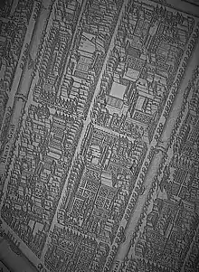 Van Dijck then changed career to become a specialist in cutting steel punches, the masters used to stamp matrices, the moulds used to cast a letterform in metal type.[lower-alpha 2] How he began this career change is not documented; John A. Lane, a historian of printing in the Netherlands and expert on van Dijck's career, speculates that he may have begun by cutting types for other typefounders.[12] In 1647 he rented a house on the Bloemgracht in which he set up a type foundry.[7][12][15] This was close to the printing office of his client Joan Blaeu.[12] By the end of his career his foundry was based on Elandsstraat.[16][17] He died in November 1669 and was buried in the nearby Westerkerk.[17] His near contemporary Rembrandt had been buried there the previous month.[18]