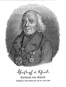 Christoph von Schmid (15 August 1768 Dinkelsbühl, Bavaria – 3 September 1854 Augsburg) was a writer of children's stories and an educator. His stories were very popular and translated into many languages. His best known work in the English-speaking world is The Basket of Flowers (Das Blumenkörbchen). In this work, fifteen-year-old Mary is taught all the principles of godliness through the flowers planted and cared for by her father, James, who is the king's gardener. When she is falsely accused of stealing and temporarily banished, her friends try to find some evidence in order to prove that Mary didn't do anything wrong until it's too late. In recent years, The Basket of Flowers has been published in the United States as part of the Lamplighter Family Collection.