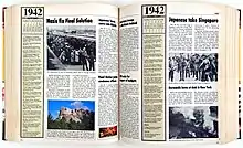The book is a month-by-month chronicle of the events of the twentieth century, with each month allocated a single page and a few eventful months given two pages. Each month includes a calendar and a list of events by day that do not receive a full report. The style is journalistic with each entry written in the present tense as though it were a contemporary news report and given a specific date and headline,[4] but prepared with the benefit of hindsight. The U.S. edition, for instance, reports the Wannsee Conference of 20 January 1942 on that date under the headline "Nazis fix Final Solution",[5] despite the existence and results of the conference being secret at the time and the resulting protocol only being discovered by the Allies in 1946.[6]