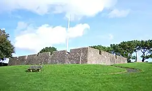 In the mid 19th-century, the East-the-Water of gun platform was rebuilt in stone as a five-sided folly by James Ley from Northam, who gave it 14-gun emplacements instead of the original eight. Seven old cannons on wheeled wooden gun-carriages were also installed at the stone fort.[1] Ley's interpretation of "Chudleigh Fort" was for it to be a belvedere that provided elevated views across the town and the River Torridge; it had no genuine military purpose with thin stone walls and an open rear. The plaque on the wall states "Fort erected by Major-General Chudleigh. April 1642". However, this is an error as the Civil War did not start until August 1642.