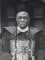 He studied at St. Xavier's Institution on Penang Island.[104] He was a patron of the Khek Community Guild (Singapore). He was appointed trustee of the Penang Tseng-Lung Hui-kuan in 1916 and tasked with overhauling the association, removing irresponsible elements from the association and repairing its premises.[105][106] He also played an important role in the administration of the country, and was both a State Councillor and a Federal Councillor. He was a member of the Perak State Advisory Board and the last Kapitan China of Perak and Malaya. In 1900 he replaced his father as member of the Perak State Council, a position held by Chung Keng Quee since the council was first formed in 1877 and remained on the council till his resignation in 1927.[107][108][109][110] On 24 March 1921, His Highness Iskandar Shah K. C. M. G., the Sultan of Perak, conferred on him the title of "Kapitan China". His installation ceremony was held on 28 March in the royal town of Kuala Kangsar and included a procession that went around the town, accompanied by firecrackers.[111]