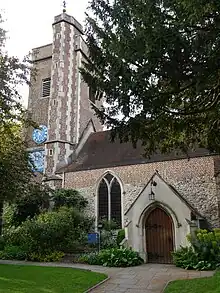 Church Road, Barnes is a street in Barnes in the London Borough of Richmond upon Thames.[1] It runs from the junction between Rocks Lane (heading south towards Barnes Common and Barnes Station) and Castlenau (running northwards to Hammersmith Bridge) by the Red Lion pub, westwards to the end of Barnes High Street. It takes its name from the St Mary's Church, a Church of England building dating back to the twelfth century. Also located on the street are the Sun Inn and the early eighteenth century The Homestead, both Grade II listed.[2][3] Barnes Green runs on the south side of the street. The Olympic Studios were located in the street, notable for the records that Jimi Hendrix made there.[4]
