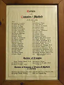 The names given below are from the List of Campton Rectors held by Central Bedfordshire Council. There is a parchment sheet with a list of rectors displayed inside the church (see image). This list differs with spellings and dates and where anomalies exist, they are annotated. The current incumbent is the Reverend Dean Henley who acceded in 2006.[23]