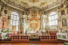 During the centuries, the wooden church was repaired and rebuilt many times. The church was rebuilt in 1648 and 1675. The present-day church was consecrated in 1774 and completed in 1778. It features folk architectural forms. In 1888, the church was enlarged by adding a sacristy and its altars were gilded. The church tower was built in 1867 and the belfry was added in 1899. The church and major buildings survive from 1899 without major alterations.[1] The church is built from wood. It has one nave but a Latin cross floor plan. Side chapels are separated from the main nave by wide segmental arches. The interior is decorated in folk Baroque style with wall and ceiling murals and Doric columns. The church has five altars.[5] Its pipe organ was built in 1854 and has 13 stops. Its pedal keyboard is not connected to the pipes and was likely added in the 20th century.[6] The belfry measures 6.4 by 4.26 metres (21.0 ft × 14.0 ft) and reaches 9 metres (30 ft) in height. It has a hip roof, two floors, and three bells named after Saints George, Joseph, and Thecla.[7]