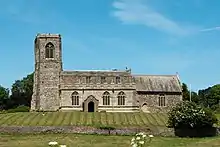 When the Albemarle family line died out, their estate and the advowson for the church reverted to the crown c. 1294, with Edward I granting the church to Meaux Abbey in 1305.[8] When built, the church was on a mound in-between the castle and the developing village, on what is now the B1249 road between Skipsea and Beeford.[9][10] At that point, the church was over an hour's walk to the sea eastwards, but the erosion of the coast has left the village and church very close to the coastline.[11]