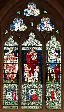 The original windows were replaced, between 1902 and 1914, with 14 designs by Sir Edward Burne-Jones, a brother-in-law of Alfred Baldwin. Louisa Baldwin commissioned the windows. She is buried at the church.[2] The windows are dedicated to members of the MacDonald, Baldwin and Burne-Jones families; one shows Louisa Baldwin's only child, the future prime minister, Stanley Baldwin, setting out on life's journey accompanied by a guardian angel.[3]