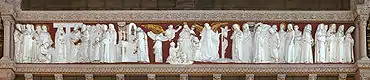 The frieze contains depictions of 320 people, life size, made of plaster or marble dust dissolved in the adhesive. Its dimensions are impressive: it measures 2.14 meters high and spans the entire perimeter of the church, just below the ceiling.