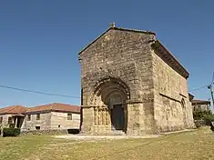 The longitudinal plan of the church is composed of a single-nave and rectangular presbytery (which is lower and narrower), with northern sacristy and tiled roof.[1] Its principal facade terminates in the gabled roof and includes a central portico on the ground floor, consisting of four columns supporting an architrave with decorative zoomorphic motifs.[1] The columns of this portico are decorated with monkeys, human figures (interpreted as the Virgin Mary and Angel Gabriel), entwined serpents and eagles with their beaks within a cornucopia. The capitals are decorated in vegetal forms or zoomorphic patterns.[1] The first archivolt has a rosetta and rings, the second monkeys, the third monoliths and human figures.[1] The tympanum includes a central figure of Christ secured by two angels.[1] These images imply a level of universal surrender of the human forms by figures within the archivolt, while others suggest that the figures represent the figures of the Apostles of Christ, who were depicted as being represented by the types of images.[1] Also problematic in this interpretation are the two figures of Mary and angel Gabriel (normally associated with the Annunciation) and who Lourenço Alves interprets as monks.[1]