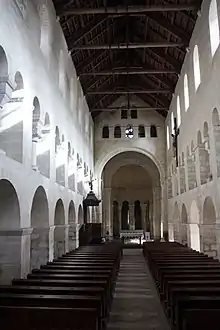 The church follows the traditions of basilicas of the high Middle Ages but experiments with a three-level elevation with a clerestory. The column capitals exhibit simple sculpture which would later be elaborated.