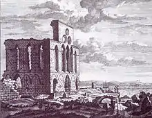 In 1291 the city was destroyed by the Mamluk sultan Al-Ashraf Khalil. According to al-Maqrizi, after his victory the sultan ordered one of his amirs, ʿAlam al-Din Sanjar al-Shujaʿi al-Mansuri, to demolish the city walls and the churches.[3][4] During this process, various building elements were taken away to Cairo as part of the plunder.[5] One of these was a Gothic portal which was later incorporated into the Madrasa of Al-Nasir Muhammad, begun by Sultan Al-Adil Kitbugha in 1295 and completed by Sultan al-Nasir Muhammad in 1303.[6] The origin of this portal is debated, but some authors, such as Camille Enlart, attribute it to the Church of Saint Andrew.[7][8][9] The battered two-story shell and arched halls of the church remained standing in Acre until the 18th century.[10]