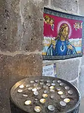 Excavation works were carried out in the area between the church and the mosque as well as in the churchyard.[5][4] After the removal of some 0.30–0.50 m (1 ft 0 in – 1 ft 8 in)-deep dirt, column pedestals were unearthed, and placed on a ground of fine-cut limestone. A masonry well of 1.50 m (4 ft 11 in) depth still containing water has three different superimposed well tops, most likely due to the rising of the ground level with the dirt during all the years before. In the eastern section of the northern yard, a stone-covered platform is situated reachable by three stairs. A sarcophagus with acroterion was discovered under the platform. The eastern yard is covered with trees. Graves spreading the entire area were found in the western yard after the removal of nearly 7 m (23 ft)-thick dirt. The graves were dug in the east-west direction and were built in rubble masonry or spolia. The skeletons are found laying on the back, arms crossed on the chest and heads turned facing east. In particular, children's graves and items were found such as glass bracelets, and necklaces made of various beads and trims. Graves with late-period characteristics reveal the Christian burial customs of Assyrian people.[4]